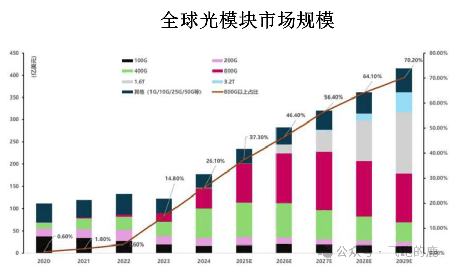 2020 到 2024 年全球光模块营收从 112 亿美元涨到 178 亿美元,年增长率 12.2%,预计 2029 年能到 415 亿美元,年增 18.5%。其中高速光模块800G 作为主流高端款,2020-2024 年年增达 188.1%;下一代 1.6T 光模块受更高带宽、更低功耗需求推动,2024-2029 年预计年增 180%,会迎来爆发式增长。
