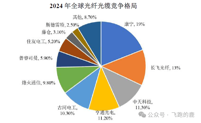 2024 年全球光纤光缆市场份额较集中,前 10 强企业分属美、中、日等 5 国,合计占 92% 的市场份额,美国康宁以 19% 居首,中国的长飞光纤、中天科技等四家企业进入前十,其中长飞、中天、亨通位列第二至第四,烽火通信排第六。