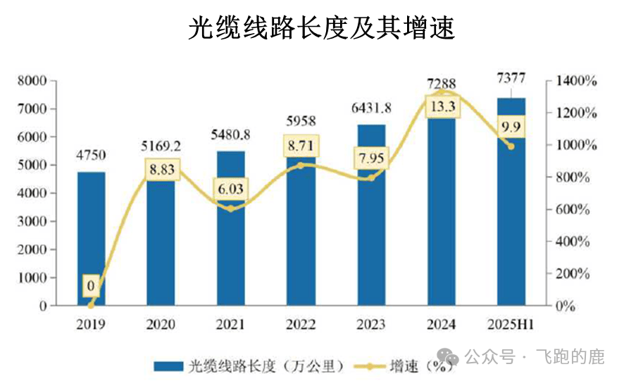 中国是全球光纤光缆的 “头号生产和使用大国”,国内通信基建不断推进,带动光缆线路长度稳步增长。截至 2025 年上半年,全国光缆总长度已达 7454 万公里(相当于绕地球近 1860 圈),同比涨 9.9%,其中接入网光缆占比近 60%,本地网中继光缆占 38.5%,长途光缆仅占 1.6%。